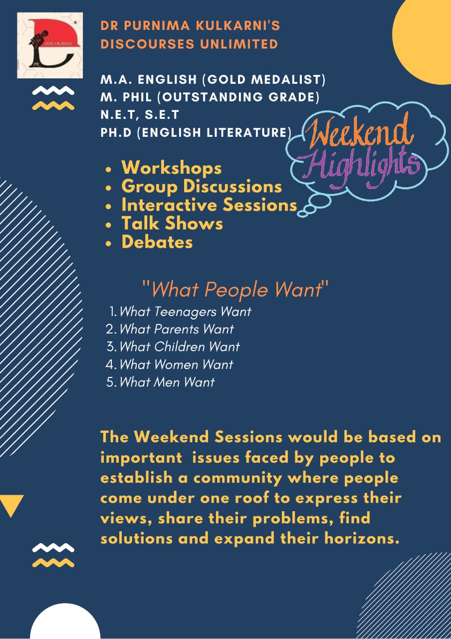Dr. Purnima Kulkarni is a Research Scholar, Motivational Speaker, Soft Skills Trainer, Author, Content Writer and a Professor of English at UG and PG level. She has more than 15 years of teaching experience in the field. She is a Gold Medalist in English from RTM, Nagpur University and was awarded an “O” (Outstanding) Grade for her erudite M.Phil Thesis. She has had the privilege of working in esteemed Institutions all over Pune like Fergusson College of Arts, S.P. College, Garware College of Arts, International Centre, University of Pune, VIT, Nowrosjee Wadia College, Abeda Inamdar College and St. Mira’s College for Girls, Pune. She has also been a member of Board of Studies under autonomy for the designing of FYBA, FYB.com and TYBA English Syllabi and compilation of textbooks. She is often invited as a judge for vocal competitions. She has been a research scholar at residence EFLU (English and Foreign Languages University) and OUCIP (Osmania University Centre for International Programs, Hyderabad) She visited Globe Theatre London, United Kingdom for Shakespeare Studies. She has published several research papers in International journals, International Conference proceedings, National conference proceedings and has also contributed a chapter to a book on The Theatre of Mahesh Dattani. She completed her Doctorate in English from SPPU, Pune and has established an English Language & Personality Development Institute of her own called Dr. Purnima Kulkarni’s “Discourses”: An English Language Learning Initiative.